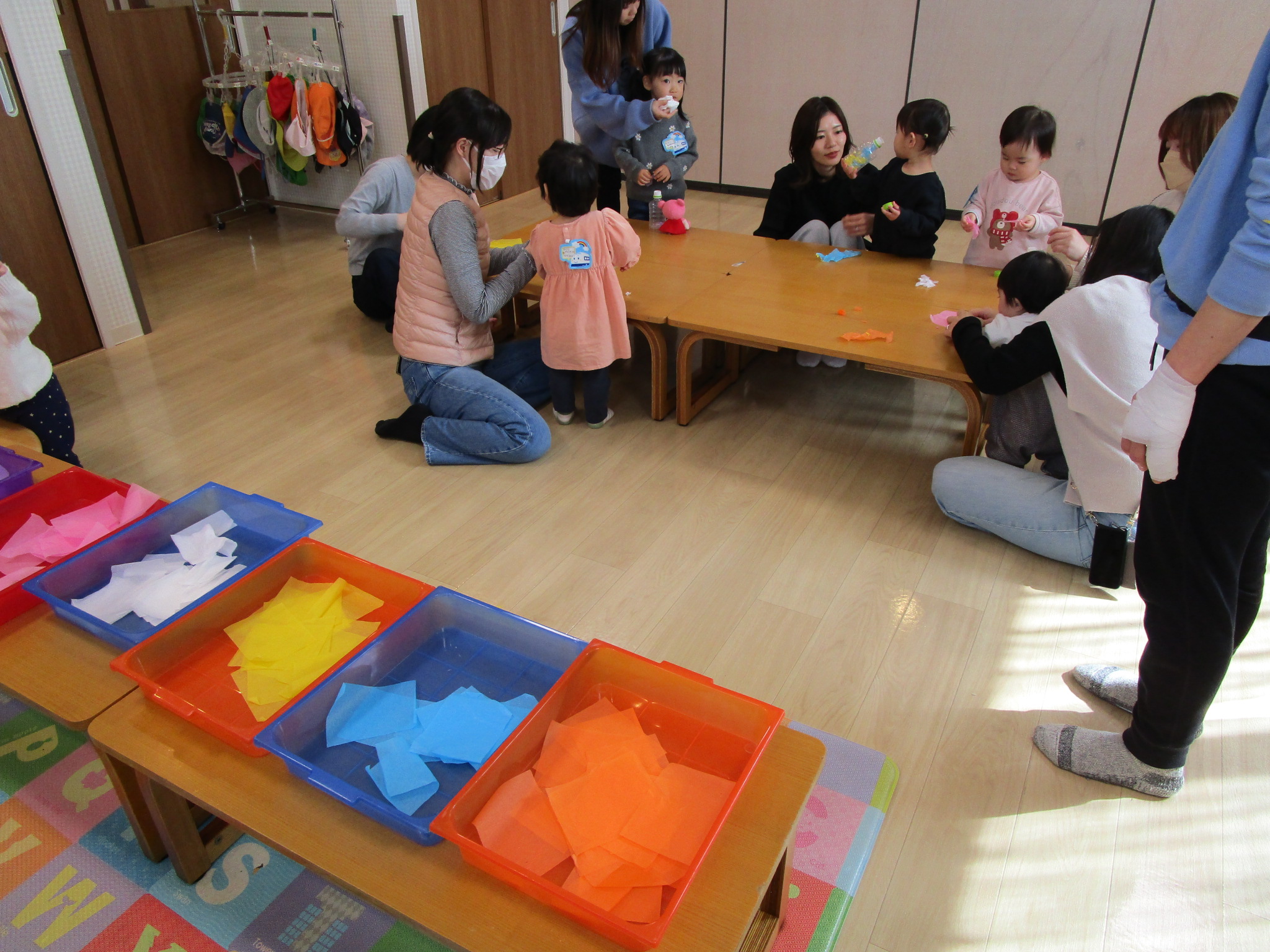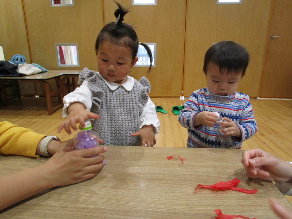 先週と今週はおはながみで遊びました🌸好きな色を選んだりちぎって丸めてペットボトルにつめてオリジナルジュースの完成!