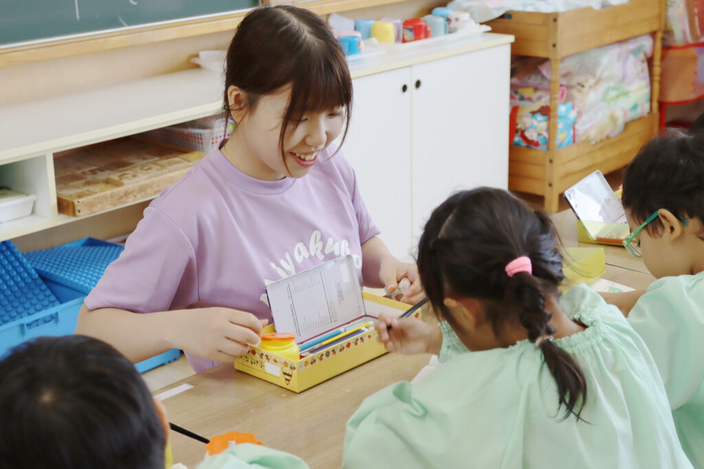 今は年少クラスの担任を、先輩の先生と一緒に担当しています。毎日同じ子どもたちと関わる中で、制作や遊びを通して「少しずつ成長しているな」と感じられる瞬間がたくさんあります。たとえば、お友達の道具を無意識に使ってしまった子が、「貸してって言おうね」と伝えることで次から言えるようになったり、「ちょっと待ってね」と優しく返せるようになったり。そんな些細な変化に気づけるのは、毎日一緒に過ごしているからこそ。子どもたちの心の成長に寄り添えるのが、この仕事の一番のやりがいです。